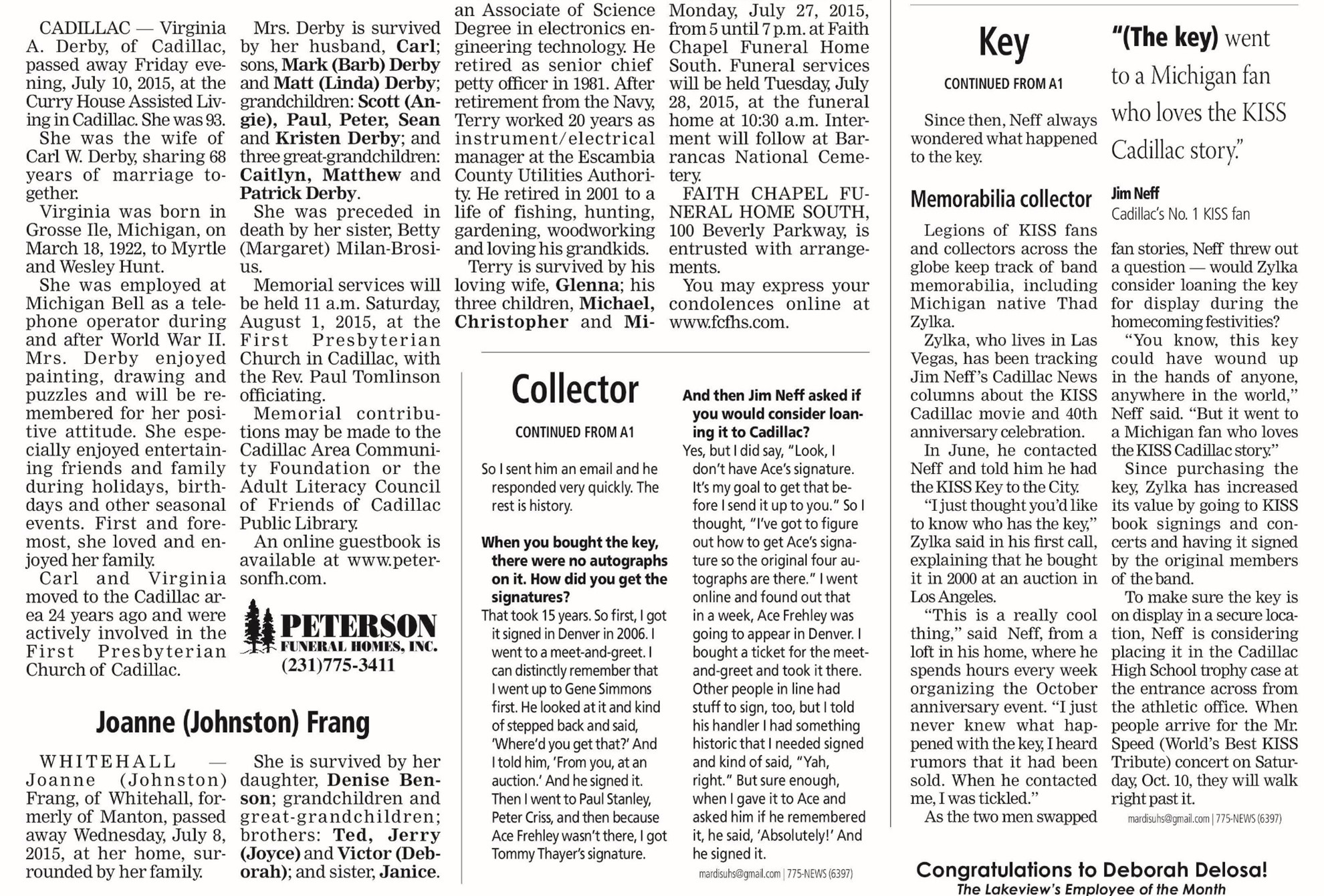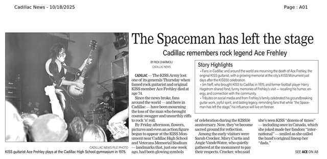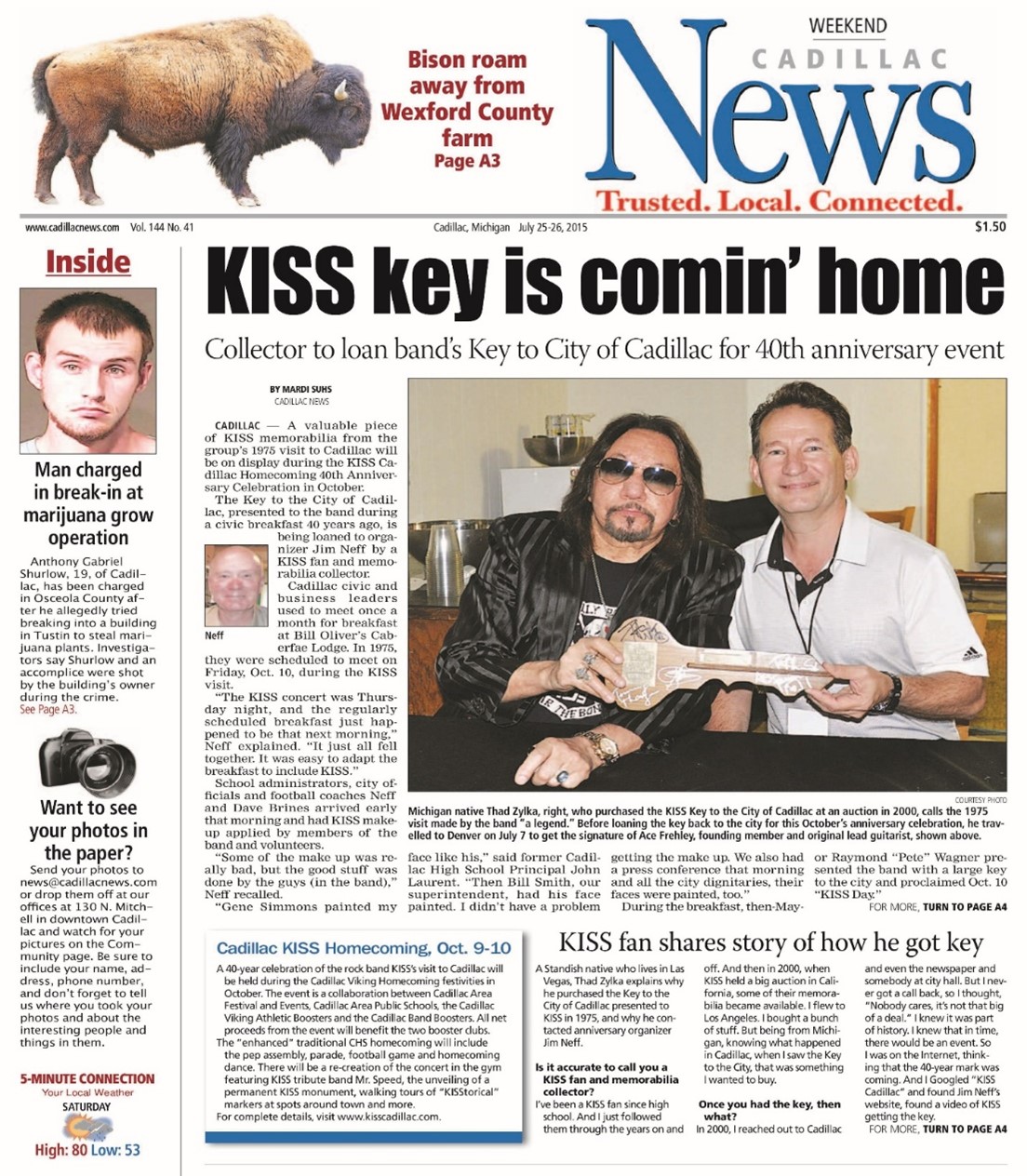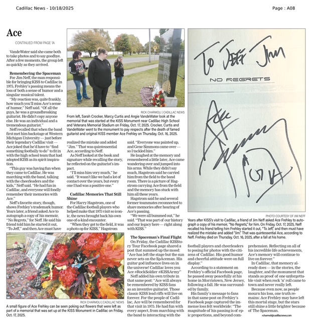 As I mentioned above, Ace was the last signature on the Key KISS got in 1975 at the meeting with the City Leaders. Jim Neff the football coach who got KISS to Cadillac wrote a very nice article and the Cadillac news covered the story.